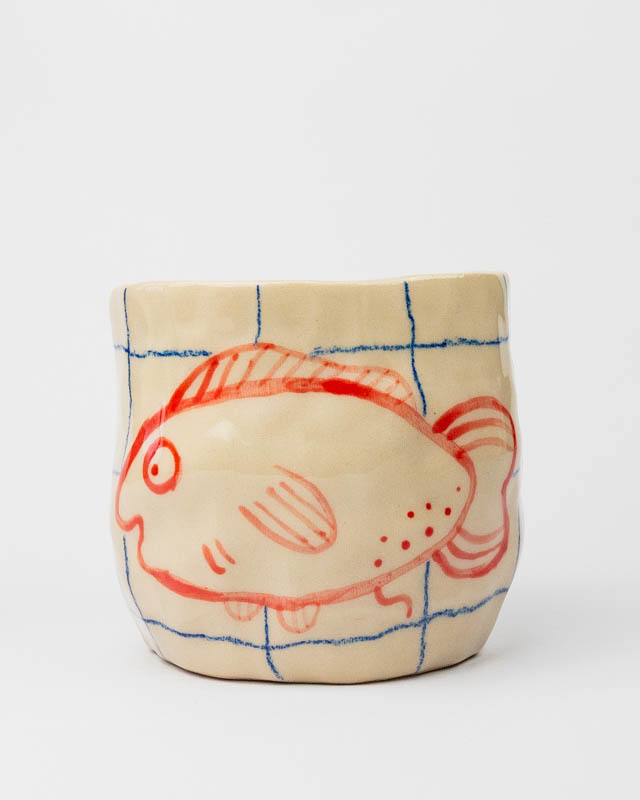 Hver kop er håndlavet og derfor unik i form, størrelse, fisk og blyantstreg.
