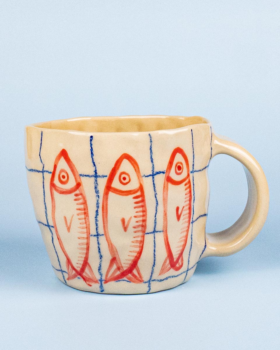 Hver kop er håndlavet og derfor unik i form, størrelse, fisk og blyantstreg.