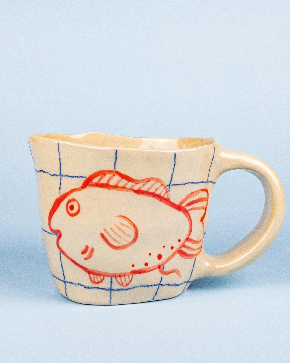 Hver kop er håndlavet og derfor unik i form, størrelse, fisk og blyantstreg.
