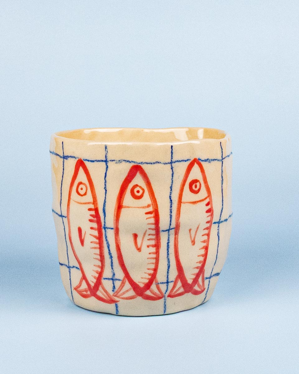 Hver kop er håndlavet og derfor unik i form, størrelse, fisk og blyantstreg.