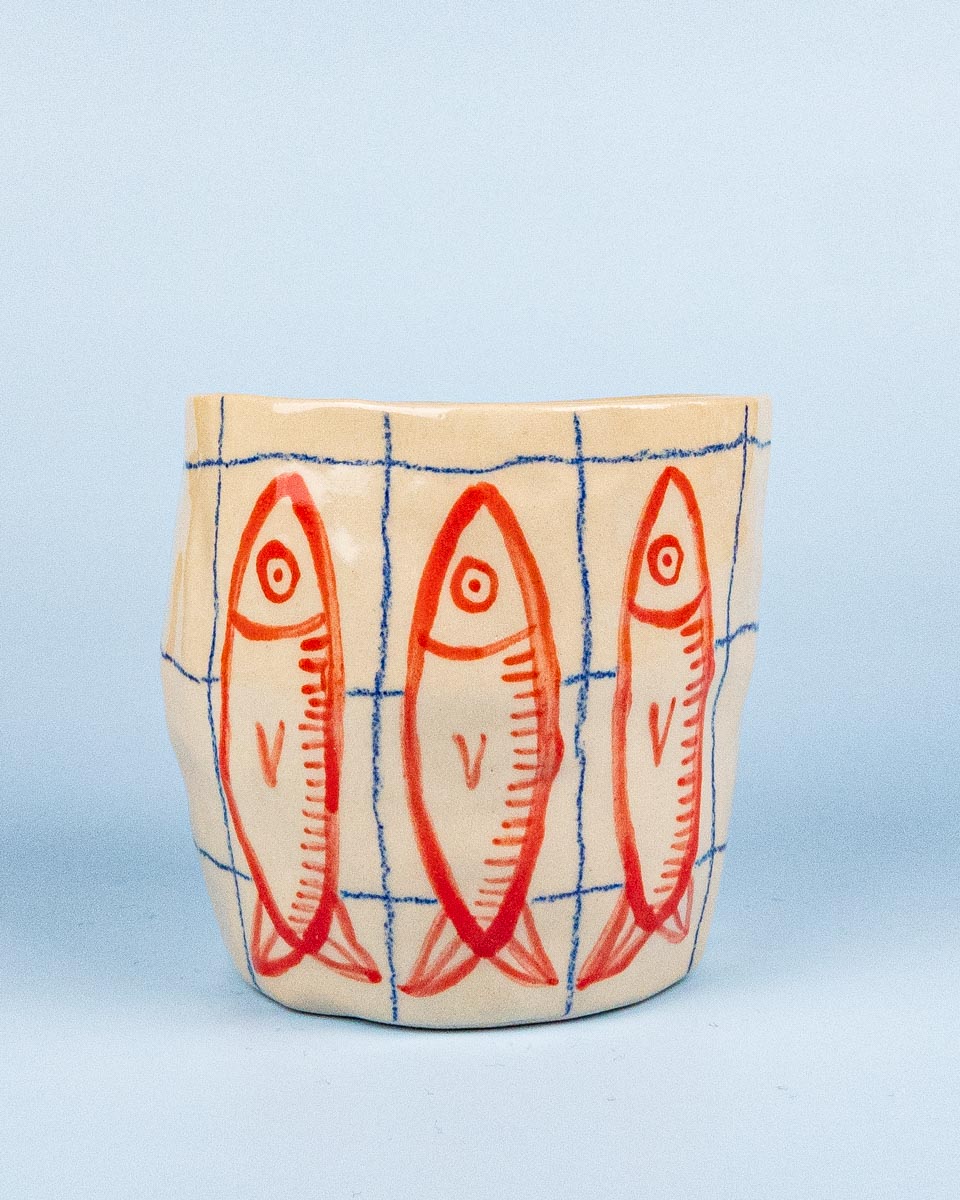 Hver kop er håndlavet og derfor unik i form, størrelse, fisk og blyantstreg.