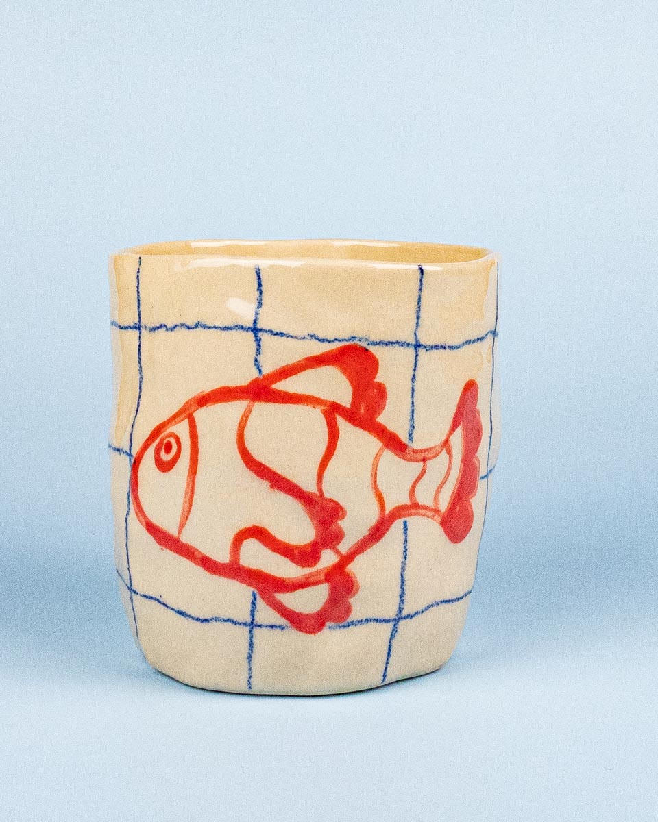 Hver kop er håndlavet og derfor unik i form, størrelse, fisk og blyantstreg.