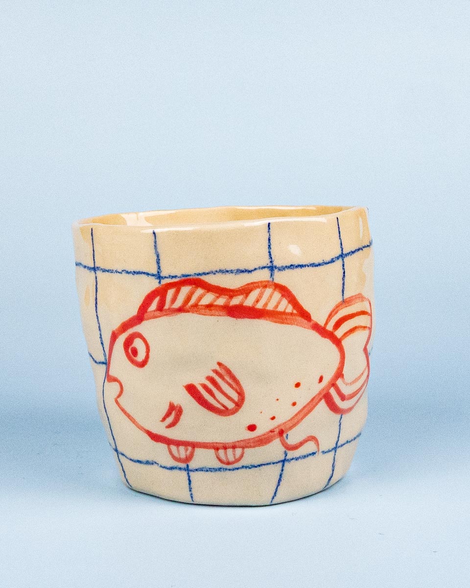 Hver kop er håndlavet og derfor unik i form, størrelse, fisk og blyantstreg.